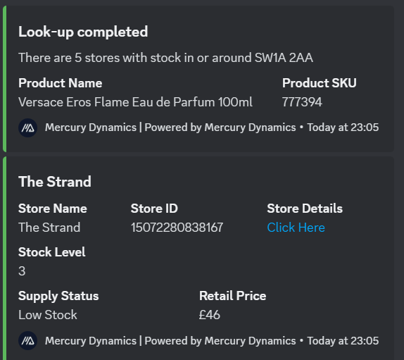 The results from the completed command will display which store in the area of the postcode is stocking said product. It will display the price within the store as well as linking you to store details.